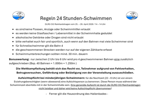 Die DLRG Reinhardshagen veranstaltet vom 25. – 26. April im Hallenbad Reinhardshagen / Vaake wieder ein 24 Stunden-Schwimmen. Diese Veranstaltung ist für Kinder und Erwachsene gedacht und geht zwar 24 Stunden, aber die Teilnehmer können jederzeit ins Wasser, wieder raus und nach Wunsch wieder rein. Auf der eigenen Zählkarte werden die geschwommenen Bahnen von unseren Bahnzählern erfasst. Je nach Alter ist für eine Bronze-, Silber - und Goldmedaille eine bestimmte Strecke zu schwimmen. Neben dem Einzelschwimmen kann zusätzlich auch eine Gruppenwertung erfolgen.